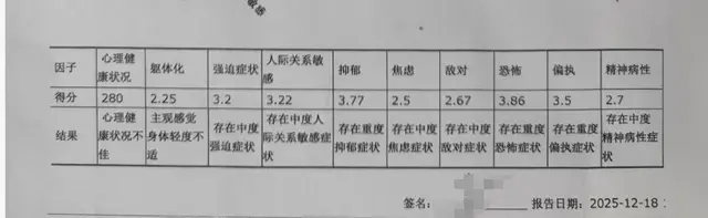 医院2025年12月18日出具的《心理健康临床症状自评量表》显示,周雨存在重度抑郁症状、中度焦虑症状、中度敌对症状、重度恐怖症状、重度偏执症状、中度精神病性症状等。