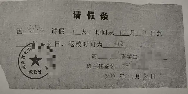 根据盖着所在学校印章的《请假条》显示,因生病请假一天,从11月7日至11月8日,学生周雨。班主任签名“刘某”。